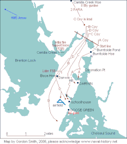 During the Falklands War, HMS Arrow was anchored in the loch, providing covering fire for the Battle of Goose Green.[3]