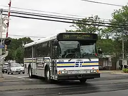 A Suffolk Transit bus in the hamlet, crossing the Long Island Rail Road's Main Line in 2008.