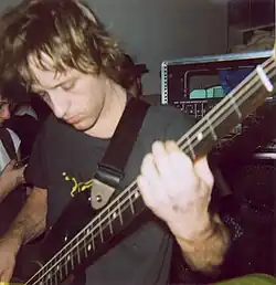Brian Gibson is particularly known for his unique and complex set-up, tuning, and use of his bass guitar. The majority of Gibson's playing draws on fairly simple loops and major/minor chord structures, yet also employs more advanced guitar techniques, such as tapping. Gibson’s bass guitar is normally tuned to standard cello tuning in intervals of fifths (C G D A E), with the high A and E strings being banjo strings. Gibson uses a high amount of distortion, feedback and effects. In juxtaposition to Chippendale's frenetic drums, Gibson's playing often acts as a rhythm section of sorts. With the use of his many effect pedals, Gibson often creates multiple layers of his own bass riffs. Due to the high level of distortion used, "lead" playing style, and high register tuning of his instrument, Gibson is often mistaken for a guitarist. Gibson is primarily a fingerstyle bassist. Gibson has mentioned The Who’s bassist, John Entwistle as an influence.[1]