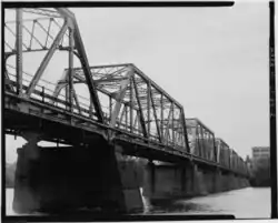 The second bridge was a 7-span through Pratt truss structure completed in 1921.[2] Each span was approximately 152 feet (46 m) long, consisting of six 25-foot-4-inch (7.72 m) panels for a total of approximately 1,064 feet (324 m) between abutments, and a 23-foot (7.0 m) curb-to-curb width.[2] The design load limit was 15 short tons (14 t), though this was reduced to 10 short tons (9.1 t) in 1977.[2] The truss structure was built by the Berlin Construction Company, directly north of the previous bridge.[2][3]
