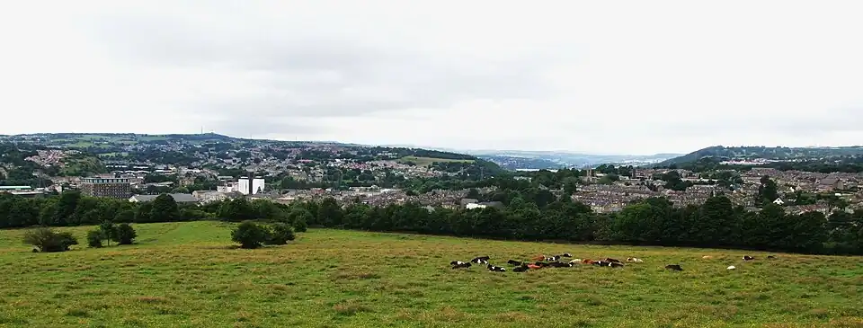 Brighouse was historically part of the township of Hipperholme with Brighouse in the large ancient parish of Halifax.[11] The township became a civil parish in 1866, but was abolished in 1894 and divided: Brighouse became a municipal borough (and civil parish), Hipperholme became an urban district and Norwood Green and Coley became a civil parish in Halifax Rural District. The Municipal Borough of Brighouse was expanded in 1915 when Rastrick was absorbed, and in 1937 when Clifton CP, Hipperholme UD, Norwood Green and Coley CP and part of Southowram UD were added. Brighouse borough and civil parish were abolished in 1974 when it became part of Calderdale Metropolitan Borough.[12] The mayor's mace was removed in 1974 to the Town Hall, Halifax, where it is displayed in the mayor's parlour to denote the authority of the Halifax mayor.[13]