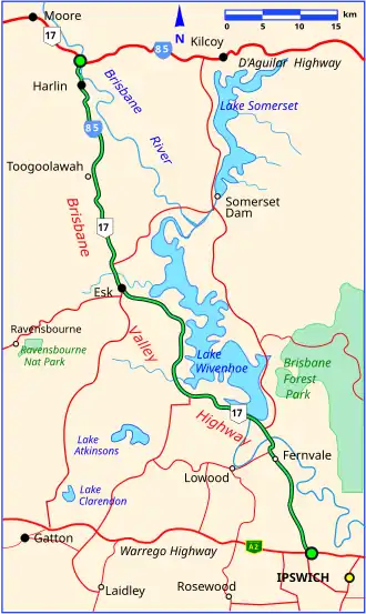 The Brisbane Valley Highway is a state highway in Queensland, Australia. It links the Warrego Highway near Ipswich and the D'Aguilar Highway about 4 km (2 mi) north of Harlin. Its direction follows the approximate course of the Brisbane River.[1] It is part of State Route A17, which is duplexed with the D'Aguilar Highway to Nanango and then becomes the Burnett Highway. State Route 85 is duplexed with the Brisbane Valley Highway from Esk to the D'Aguilar Highway.