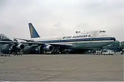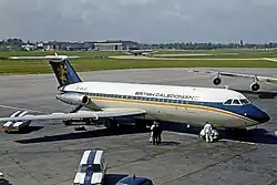 To support its ambitious expansion plans,[69] BCal acquired a number of additional, second-hand Boeing 707s from various sources through its aircraft trading and leasing subsidiaries during the early 1970s.[70][71][72] These included a pair of 320C series aircraft procured on a long-term lease from Britannia Airways featuring a two-class, "widebody look" interior. Another three 707s received re-modelled "widebody" cabins. All five were used to inaugurate the airline's transatlantic scheduled routes to New York and Los Angeles where the established competition was operating widebodied aircraft, such as the Boeing 747 "jumbo jet". It was thought that the aircraft's widebody style interiors would leave passengers with the impression that BCal was operating widebodied aircraft when in fact it was not.[1][2][39][66][73][74][75][76][77][78] During that time, BCal placed an order with the British Aircraft Corporation (BAC) for two new One-Eleven 500s and acquired additional second-hand examples.[79] At the same time, the airline disposed of some of its 707s,[33][70][72] VC10s[33][70] and One-Eleven 200s.[70][79] These included the original pair of 399C series 707 aircraft that had been delivered to Caledonian Airways direct from the manufacturer in 1967/68.[72]