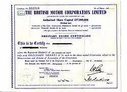In mid-1965 BMC offered to buy its major supplier Pressed Steel and took control in September with 27,000 employees.[11][12] Twelve months later, BMC merged with Jaguar Cars adding a further 7,000 employees.[13] On 14 December 1966 BMC shareholders approved the change of its name to British Motor Holdings (BMH) and it took effect from that date.[4]