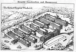 After Crimea, the recommendations of Florence Nightingale, Douglas Galton, Sidney Herbert, John Sutherland and others led to the formation of a Barracks and Hospitals Commission (1858) and the building of new Army General Hospitals in accordance with the latest design principles for improving health and hygiene.[2] The thousand-bed Royal Victoria Hospital, Netley (1863) was one of the most prominent new military hospitals of this time (albeit its design, finalised before the recommendations were published, was heavily criticised by members of the Commission).[1] The Royal Herbert Hospital, Woolwich (1865) was celebrated as an exemplary 'pavilion plan' hospital. Barrack hospitals were also rebuilt at this time according to the same principles (as happened at Hilsea, Hounslow and elsewhere).[2]