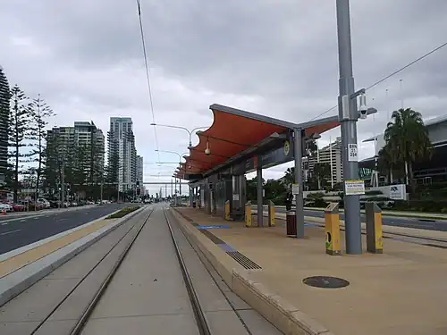 Broadbeach North light rail station located in the suburb of Broadbeach is serviced by the Gold Coast light rail system known as the G:link. The station serves the northern end of the Broadbeach precinct,[1] offering direct access to the Gold Coast Convention and Exhibition Centre, Oasis Shopping Centre and the Star Casino.