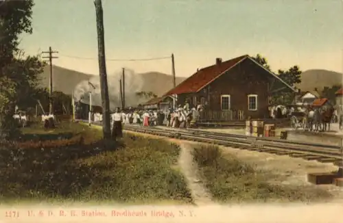 The railway station of the hamlet of Brodhead's Bridge in Olive, New York was at milepost 18.1 on the Ulster and Delaware Railroad. It was a destination for tourists and vacationers from New York City who would stay at local resort homes (boarding houses) and use the nearby Esopus Creek to swim and fish.[2] Similar resort villages named Atwood and Olive Bridge were also served by this station, which was abandoned in 1913 before it was submerged by the waters of the newly built Ashokan Reservoir.[3]