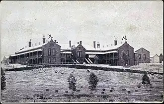 In Broken Hill’s early days the residents lived in dwellings that consisted mainly of tents or iron structure, and the small community was dealt many hardships over the including dust storms, severe heat, drought, dirty drinking water, unsanitary conditions, disease and mining accidents were commonplace. The major illnesses in the community were diphtheria, typhoid, lead poisoning, pneumonia, dysentery and enteritis and there was a high mortality rate for the young of Broken Hill.[3] In 1886 there was no medical facility in the township of Broken Hill, in contrast Silverton, New South Wales had three medical practitioners, but after BHP was approached by the Miners association it was agreed to provide a temporary hospital structure that could hold six beds, a morgue and two outhouses were also included, this first initial structure was a simple timber and iron dwelling.