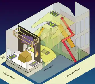 There were three sets of doors which Jackson designated as special exits. They led onto Flood's Alley, a small street running along the east side of the building that bisected the block from Johnson to Myrtle Avenue.[26][27] Each set was six feet (1.8 m) across. The southern door closest to Myrtle Avenue opened into the eastern end of the lobby, underneath the flight of stairs leading from the lobby to the dress circle. The middle set opened onto a hallway adjoining the parquet, and the northern set opened near the stage and orchestra pit. The middle set served a stairway ascending to the second floor dress circle.[28] These alley doors were normally locked to discourage gate-crashing.[27] The structure had no fire escapes in the modern sense: those that connect higher storey windows to the street. Sources from the period often called these alley doors "fire escapes," but designs of the era were untested and tended to be impractical.[29]