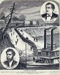 Overtones of the Civil War and racial conflict were evident. Brooks' men numbered 600 by this time and were all freedmen who supported Republicans as their emancipators. Baxter's forces, all white Democrats, continued to grow steadily during the conflict until they reached nearly 2,000.[32] Several bloody skirmishes occurred. Known as the Battle of Palarm, a small naval battle erupted on the Arkansas River near Natural Steps, where Brooks' men attacked a flatboat known as the "Hallie", thought to be bringing supplies. The shooting lasted around ten to fifteen minutes before the pilot ran up a white flag signaling a surrender. One stray bullet pierced the vessel's supply pipe between the boiler and engine, cutting off its power, and the boat drifted downriver, out of gun range, and lodged on the Southern (Western) shore. Sources vary as to the actual casualties of the incident. The boat's captain, a pilot, and one rifleman were killed; the other pilot and three or four riflemen were wounded. One source stated that the Brooks regiment suffered one man killed and three wounded; another report was that five men were killed and "quite a number" wounded.[42]