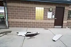 Engine nacelle fragments from United Airlines Flight 328 found in front of Broomfield County Commons Park restroom.