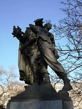 Brotherhood (Czech: Sbratření, lit.'Fraternation') is a sculpture by the Czech sculptor Karel Pokorný (1891-1962). Initially placed in Česká Třebová, Czechoslovakia in 1951, it was dedicated to the end of the Prague Offensive during World War II.[1] Its replicas were established in Prague (1960, replaced in 1988[1]), Saint Petersburg (1977) and Kurpaty, Crimea (1985). The sculpture depicts the meeting of a Soviet Red Army soldier and a Czech militiaman in May 1945. Soviet art critics evaluated Brotherhood as one of the best works of socialist realism.[2] This sculpture became a symbol of friendship between the peoples of the Soviet Union and Czechoslovakia.[3] Its image was used on stamps, coins, banknotes, etc.