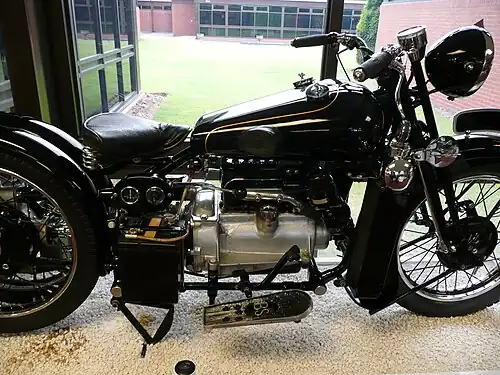 George Brough considered the four-cylinder engine ideal for a motorcycle, given its smooth running and potential for greater horsepower than a single or twin-cylinder engine of the same capacity. Brough Superior had already revealed two prototype 4-cylinder machines before 1932, using an air-cooled sidevalve V-4 built in-house (1927), and an air-cooled inline sidevalve 4 developed by Motosacoche (1928).[3] While these prototypes were never built in series, they generated tremendous attention at shows and in the press . In 1930, George Brough considered using an engine already in production, in this case the well-developed Austin 4-cylinder sidevalve, water-cooled motor of 747cc. Brough increased the engine displacement by 50 cc to 797 cc and added a light alloy 'sports' cylinder head for more horsepower. George Brough claimed a significant increase in the Austin's power output, but, as The Motor Cycle magazine observed, this was a luxury motorcycle intended for use with a sidecar, not a sports machine.[1] Power output was actually quite low, and the performance was inhibited by the use of standard Austin rear-axle ratios. The brisk acceleration with a heavy sidecar fitted would, however, more than compensate for lack of top speed.[4]