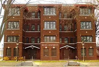 Brown Apartments is a historic building located in Cedar Rapids, Iowa, United States. Designed by local architect William J. Brown, this is an early example of an apartment suites building type and the first known English basement apartment building in the city.[2] Other innovations from the time of construction include the janitor's living quarters, a common laundry room, and tenant storage areas. The building's first owners were Arthur and Elizabeth Brown. He was an ice cream manufacturer and marketer, and it is unknown if he was related to the architect.[2] The four-story, brick structure features American Craftsman influences. The symmetrical facade consists of three projecting solarium bays between which are the entry ways into the building. Both of the entry porches has heavy wooden brackets, and each bay is capped with distinctive wood parapets that are supported by heavy timber brackets. Regionalist painter Marvin Cone lived in the building from 1920 to 1923. He dedicated two oil paintings to the Browns in lieu of rent.[2] The building was listed on the National Register of Historic Places in 2010.[1]