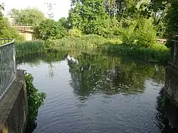 The millpool and stream. The West Anglia Main Line railway bridge is in background