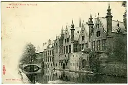 The governing body of the Liberty of Bruges was located at the Burg, the square in Bruges where both the civil and ecclesiastical administration were located. Initially the Liberty was seated next to the Steen (castle of the count), on the west side of the Burg. In the 15th century, the Liberty moved to the other side, where it took over a portion of the count's former court, the Dukes of Burgundy having moved their residence to the newly built Prinsenhof (Bruges). In 1434–1440 the Liberty added a tribunal to the southern side, facing towards Groenerei, a canal in Bruges. In 1520–1525, the complex was extended along the row with a new high tribunal, the aldermen's chamber and an entrance-hall. The architect was Jan van de Poele. A gallery with high arches was built on the Burg-side in 1528–1532. In 1606–1607, a chapel was added next to the aldermen's chamber and in 1664–1666 an orphan room, in which records of the castellany's orphans were kept. The still existing façades on the Groenerei side was built at this time. Lastly, the part of the manor that is visible on the Burg, and which was significantly enlarged by the purchase of the Love in 1555, was rebuilt in 1722–1727 in the Neoclassical style after a design by Jan Verkruys.