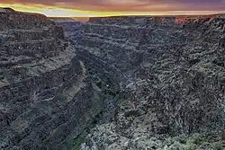 The Bruneau River is a 153-mile-long (246 km)[3][4] tributary of the Snake River in the western United States, located in Idaho and Nevada. It runs through a narrow canyon cut into ancient lava flows in southwestern Idaho. The Bruneau Canyon, which is up to 1,200 feet (370 m) deep and forty miles (65 km) long, features rapids and hot springs, making it a popular whitewater trip.