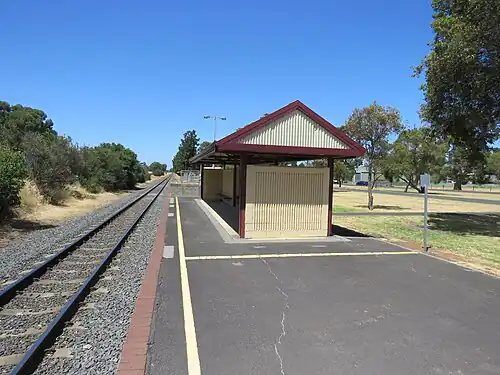 In 1981 after years of neglect and declining use the station building was demolished and replaced with a basic shelter, which still stands today.[3] After declining usage in 1988 the Brunswick Junction to Narrogin line was truncated at Collie, where it ends today.