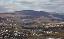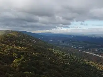 The higher southwest section of Brush Mountain looking southwest toward Altoona. Interstate 99 is lower right. The Allegheny Front is center right, with Blue Knob in the center.