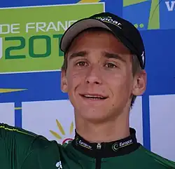 In May, he won his first professional stage race at the Four Days of Dunkirk; he won the first three stages, finished second in the remaining two, and won the points and young rider classifications as well.[52][53] He won another French stage race the following month, when he won the Boucles de la Mayenne; he won two stages,[54] including a victory in the prologue individual time trial,[54] and the points classification. In his build up to the Tour de France, he won the first two stages of the Route du Sud,[55][56] but failed to finish the race. At the Tour de France, his best stage result was a second-place finish to Marcel Kittel in Limoges on stage four.[57] He took two further podium finishes over the remainder of the season, with third-place finishes at the Grand Prix de Fourmies and the Tour de Vendée.[58][59]
