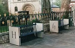 | 1989 | Gloucester Cathedral | Memorial to Sylvanus Lysons[55] | Slate carving | "This Chapel was reordered to mark the nine hundredth anniversary of this Cathedral Church & in memory of Sylvanus Lysons 1665-1731 Benefactor in the parish of Hempsted & in the Diocese of Gloucester DEO GRATIS 1989" | Bryant Fedden |