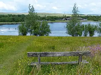 ![]() A view from a bench in a meadow overlooking the Bryn Bach lake with the visitor centre in the distance | |