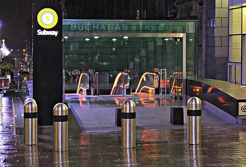 Buchanan Street subway station is a station on the Glasgow Subway in Scotland. It serves the major shopping thoroughfare of Buchanan Street, and is one of two stations on the Subway (along with St Enoch) that directly serve the city centre. Close to Buchanan Bus Station and providing interchange with Glasgow Queen Street railway station via a travelator, it is the busiest station on the Subway, with 2.48 million passengers recorded in 2024.[9]