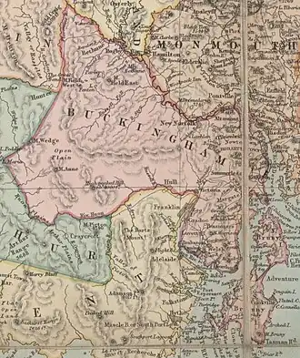 An earlier Buckingham County existed from 24 September 1804 until 1813 as an administrative division whilst Van Diemen's Land was administered as two units. It was defined as all of Van Diemen's Land south of the 42nd parallel (between Trial Harbour and Friendly Beaches, and governed by David Collins. Cornwall County occupied the remainder of the island.[1][2]