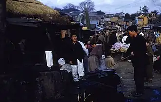 Many foreign products were not legally available to South Koreans, and some were made artificially expensive due to tariffs even until 1987.[27] During a crackdown on black market trading under the Park Chung Hee administration, smuggling food like Spam was a crime punishable by death.[34] To circumvent this, goods were smuggled off bases.[27][10] Canned goods were particularly prized for their long shelf life and taste.[27] Black markets called "Yankee markets" (양키시장; Yangki-sijang) formed that specialized in the trade of these goods.[27][14] Some of these markets still exist today, including one in Incheon, although they are now regular markets.[35]