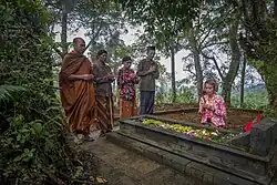 A Theravādin monk leading the Nyadran ceremony (a Javanese veneration of the dead tradition) in Dusun Krecek, Kaloran, Temanggung Regency, Central Java, along with other Javanese who adhere Kejawen, Islam, and Catholicism.