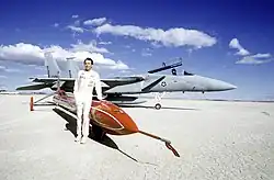 Stan Barrett stands beside the Budweiser Rocket car