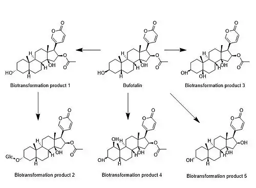 The mechanism of the biotransformation of bufotalin is still unknown. Researches found, that bufotalin is biotransformed into at least 5 different compounds.[11]