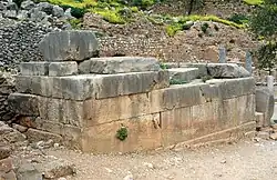 On the right hand side, straight after the entrance to the sanctuary of Delphi, one sees the base of the bull that the Corcyraeans dedicated at about 480 B.C., in order to commemorate an exceptionally good catch of tuna fish. The statue was made by the sculptor Theopropus from Aegina. According to Pausanias,[1] a bull in Corfu every day abandoned the flock and went down to the seashore, moaning. The herdsman watched him and followed him, thus noticing that the sea was full of fish. He alerted his fellow citizens and they rushed to the seashore, but they couldn't get hold of the fish. Then, they sent an envoy to the Delphic oracle and, following her advice, they sacrificed a bull to Poseidon and then caught the fish. With the tithe of the revenues they acquired by selling the fish, the Corcyreans erected the bronze bull.