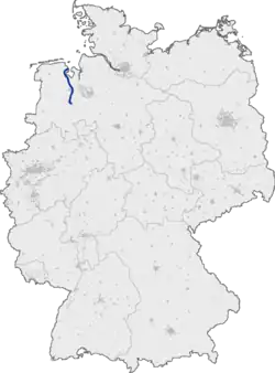 In order not to interfere with shipping traffic, the Hunte in the east of Oldenburg is crossed by a ten-span high bridge over 441 meters long and 30 meters high, which was opened on 26 October 1978.[3][4] As the load-bearing capacity of the bridge is no longer guaranteed in the long term, it was decided to build a replacement. The new bridge will also be 441 meters long and just under 30 meters high, but 31 meters wide and will be supported by 14 piers instead of 36. Construction work began at the end of 2023 and should be completed by the end of 2029.[5]