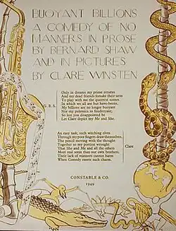 It was published in "an especially attractive edition" in Zürich.[1] A limited edition of Buoyant Billions was published in London in 1949, with illustrations by Shaw's neighbour Clare Winsten.[1]