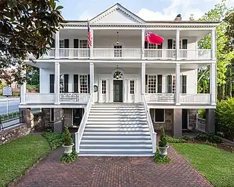 Bishir also comments on the need for ventilation in coastal North Carolina, which she argues motivated some, including Burgwin, to adapt the Georgian style based on the architecture of the Caribbean. Many Carolina settlers had early starts in this tropical region, or had roots that extended to the area. That, coupled with the constant trade with the area for enslaved peoples, sugar, molasses, and other necessities, influenced the architectural elements seen in Wilmington today. Such elements includes the wide hallways to allow breezes to flow through the structure, tall ceilings, the prominent piazzas, an attic that allowed for rising heat to move away from living quarters, and a raised elevation.[23]