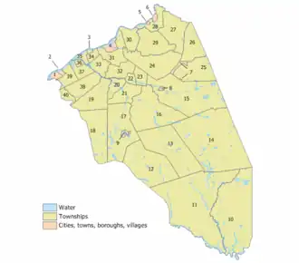 Burlington County is located east of the Delaware River and borders Philadelphia, the nation's sixth-largest city. It is part of the Philadelphia-Camden-Vineland, PA-NJ-DE-MD combined statistical area, also known as the Delaware Valley.[11] However, the county stretches across the state, and its southeast corner reaches tidal estuaries leading to New Jersey's Great Bay, which separates the county from the Atlantic Ocean.