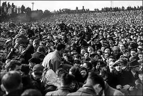 At the time, fans paid at the turnstiles rather than buying tickets beforehand. The Railway End became over capacity and closely packed so, at 2:40 pm, it was decided to close the turnstiles.[4] However, that did not stop more people entering the ground, with spectators climbing in from the railway, clambering over the closed turnstiles and, when a locked gate was opened, entering through it.[5] Such was the pressure from the Railway End, that many fans were pushed inexorably along the side of the pitch, around the far end and, eventually, right out of the ground, ending up in the car park.