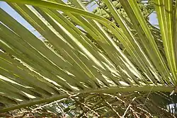 There are 11 to 31 pinnate leaves arranged spirally around the crown of the trunk.[6] The 40–130 cm long petiole of the leaf has margins armed in stiff teeth which may grow up to 4 cm in length, as well as fibres along the margins. The leaf has a rachis that is 163–200 cm in length. There are (57-)63-78 glaucous-coloured pinnae (leaflets) along this rachis, these pinnae are (58-)65–77 cm long and 2–3 cm wide in the middle of the leaf. The pinnae are inserted at a single plane on both sides of the rachis, such that each pair of pinnae form a 'V'-shape.[4][6]