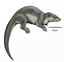Buxolestes were otter-like freshwater fish predators with a body length reaching about 46 centimetres (18 in) and a tail about 35 centimetres (14 in) long. They were significantly smaller than most living species of otters. Fossilized stomach contents confirm their semiaquatic freshwater habits. The anatomy of these archaic "insectivorous" mammals is known through well-preserved Middle Eocene specimens found at Messel in Germany. Their structure evidences a clear adaptation to a semiaquatic way of life. The forelimbs and hindlimbs are powerful and show strong claws. The tail is clearly fit for swimming. The skull is long, with large molars that appear to be adapted to a diet of molluscs with shells (freshwater clams and freshwater snails), but the predilection postulated from the dentition has not been confirmed.