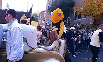 Buzz participates in several mascot contests.[6] In 1997, Buzz won an Access Atlanta poll due to creative ballot stuffing by Tech students.[16] In 2005 and 2006, Buzz was named to the Capital One All-American Mascot Teams and participated in the Capital One Mascot Challenge.[17] In 2000 and 2001, Buzz won the NCA (National Cheerleaders Assoc.) mascot of the year and in 2004 and 2006, Buzz received second place in the NCA Mascot Competition in Daytona, Florida.[6][18] On June 14, 2008, Buzz rappelled down the 40 story Viewpoint lofts building in Midtown, Atlanta as part of a university fundraiser.[19]