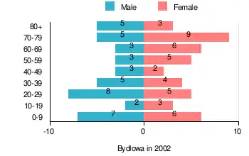 According to the 2002 Poland census, there were 84 people residing in Bydłowa village, of whom 48.8% were male and 51.2% were female. In the village, the population was spread out, with 21.4% under the age of 18, 27.4% from 18 to 44, 17.9% from 45 to 64, and 33.3% who were 65 years of age or older.[1]