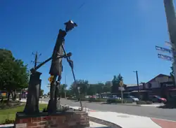 Byford contains nine sculptures developed by Zen Luks which portray historical and cultural aspects of Byford. Each sculpture is located on the 7 kilometres (4.3 mi) long Byford Sculpture trail along the South Western highway. The four northernmost are at the northern entrance after the intersection between Thomas road and South Western highway. The first is the Byford sign, followed by sculptures of a girl with a cow to represent the early dairy industry, a tractor which represents Byford's agricultural industry in the 1930s and a trotter driver to represent the trotting complex that opened in 1969. Subsequent sculptures represent Charlie Knox, a traffic inspector in Byford in the 1940s and 1950s; Sister Wossley who nursed children in the 1940s;[45] a returned serviceman; Rivorse, who ran a dead heat with Eurythmic in the 1919 Perth cup;[46] two boxing kangaroos; a brickworker who worked at the brickworks in the 1920s; a cockatoo; and a kangaroo at the southern entrance.[45]