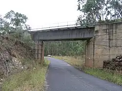 The dilapidated timber sections of Kirks Bridge, crossing Baerami Creek at Baerami were demolished and were planned to be replaced with new concrete sections by 31 August 2007.[16] Unfortunately, flooding during the 2007 New South Wales storms delayed the work by around a month. The bridge had previously been partially rebuilt, with both buttresses and two spans at one end having been reconstructed in concrete.[17]