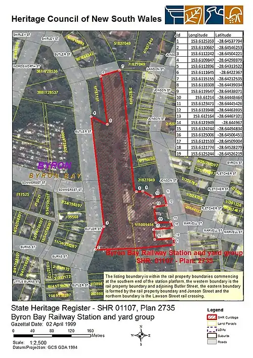 - ^ a b c d "Byron Bay Railway Station and yard group". New South Wales State Heritage Register. Department of Planning & Environment. H01107. Retrieved 2 June 2018.