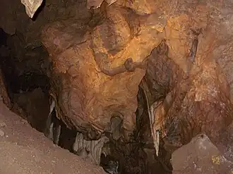 The cave consists primarily of dark limestone rocks of the middle trias, formed in tectonic cracks by water corrosion, the demolition of some parts of the ceiling and gradually enlarged by the underground river Bystra. An underground stream still flows through the bottom part of the cave, springing out in the village of Valaska. The embellishment of the cave consists of stalactites and stalagmites, from which Zvonivé stalaktity (Ringing statlctites), Beldachýn (Baldaquin) and Kovacska vyhna (Blacksmith's workshop) are specially remarkable. Except for many erosive forms a ceiling river-bed is to be seen in the cave, in which the round granit stones of the Low Tatras are attached by sinter. The cave is 2,637 metres (8,652 ft) in length and 95 metres (312 ft) in depth. It is the most important cave of the Upper Hron River Valley.[2]