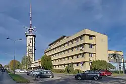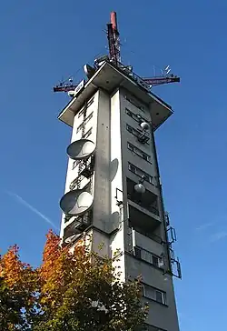 Bytków TV Tower is a 110-metre-tall (360 ft) RadioTV tower in Siemianowice Śląskie, Poland, on the border with Bytków, an urban part of Katowice. Bytków TV Tower, situated at 50°17′45″N 19°00′31″E / 50.29583°N 19.00861°E / 50.29583; 19.00861, has a unique design: it consists of a reinforced concrete tower as its base, with the appearance of a thin high-rise building with a square cross section. On the top of this concrete tower, there is a horizontal steel cross turned at an angle of 45 degree to the sides of the concrete tower. At the ends of the crossarms, which are equipped with gangways, the antenna mast on its top is guyed.