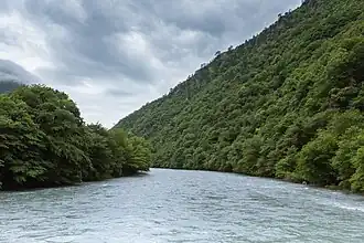 The Bzyb or Bzipi (/bzɪb/ or /bzipi/; Georgian: ბზიფი; Abkhaz: Бзыԥ, romanized: Bzyṗ) is (along with the Kodori) one of the two longest rivers of Abkhazia[1] and the twelfth longest river in Georgia.[2] The river valley has rich biodiversity of herbaceous garden plants, particularly in the gorge section in the upper reaches where the most prominent and colourful bellflower Campanula mirabilis with profuse growth of 100 flowers per plant is given the name, the "Queen of the Abkhazian flora".[3] During 1904-1917 it served as the border between the Russian Empire's Sukhumi Okrug and the Black Sea Governorate.[4]