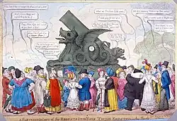 The poem was accompanied by a cartoon drawn by George Cruikshank, which showed the Prince Regent as the personification of the mortar with a queue of ministers lining up to kiss his backside.[8] Similarly, S.W. Fores published C. Williams' A Representation of the Regent's Tremendous Thing erected in the Park – "thing" being a slang term for "penis" – with predictable double entendres such as a parson saying "What an erection to be sure," to which his wife replies, "I could look at it for ever".[11] Many other cartoonists followed suit, often depicting the mortar in conjunction with the Prince Regent's then mistress Lady Hertford.[1]