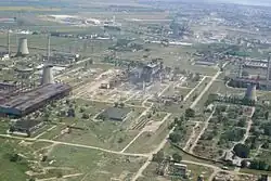 A 2010 inspection found over 100 ha (250 acres) on the site suffering from soil contamination, with waste dumped directly on the surface. Additionally, the site was littered with concrete. When the factory was pulled apart by thieves, liquid toxic material had spilled out in uncontrolled fashion. Two locations were uncovered that had large deposits in sacks believed to be filled with pearlite. Surrounding water contained ammonia and benzene, which also damaged air quality.[7]